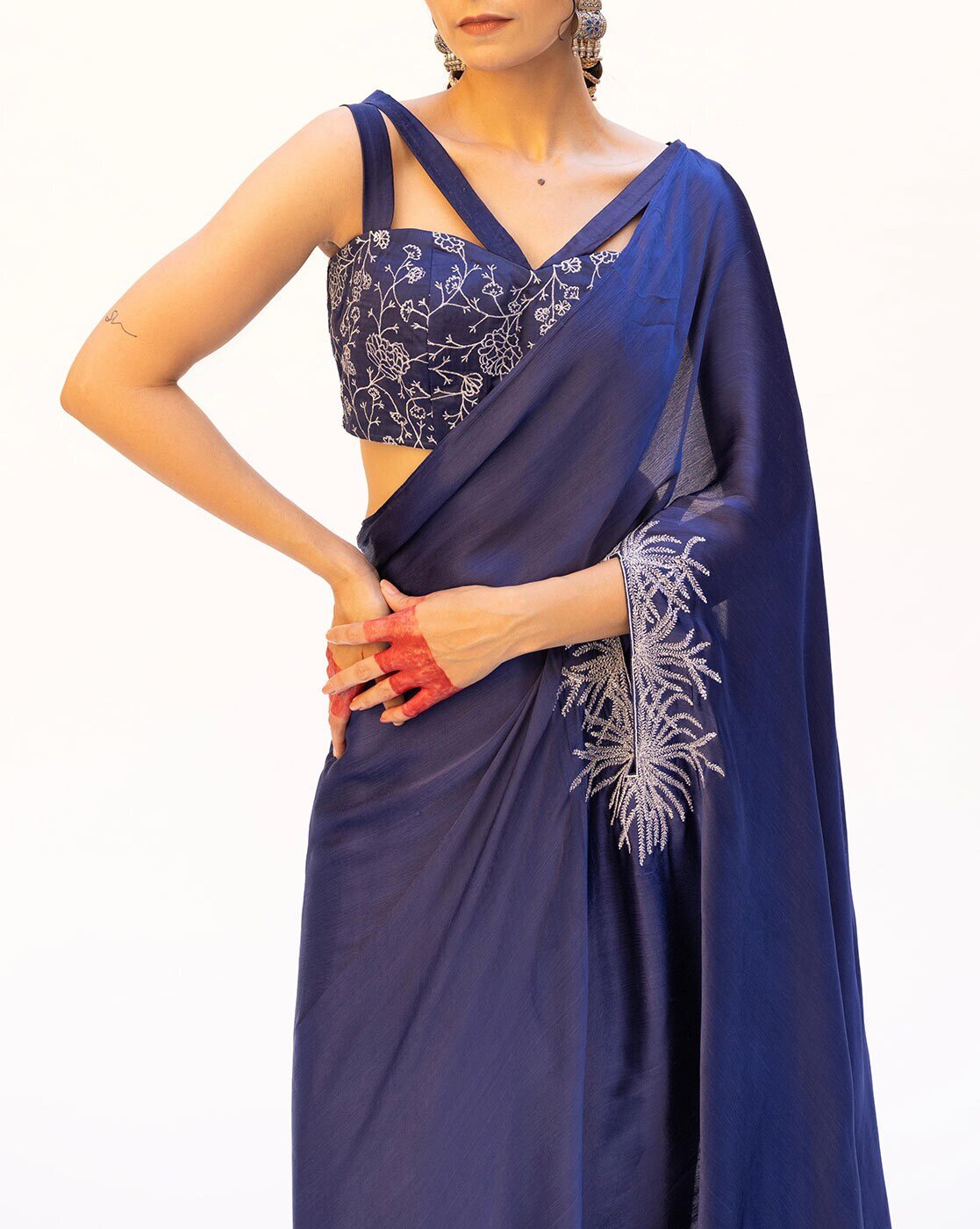 - Classic Blue pre-draped saree, featuring an embroidered slit for a touch of allure. Paired with a silver embroidered blouse, adorned with elegant strap details and a center back zipper closure. This ensemble exudes modern sophistication with a hint of traditional charm.